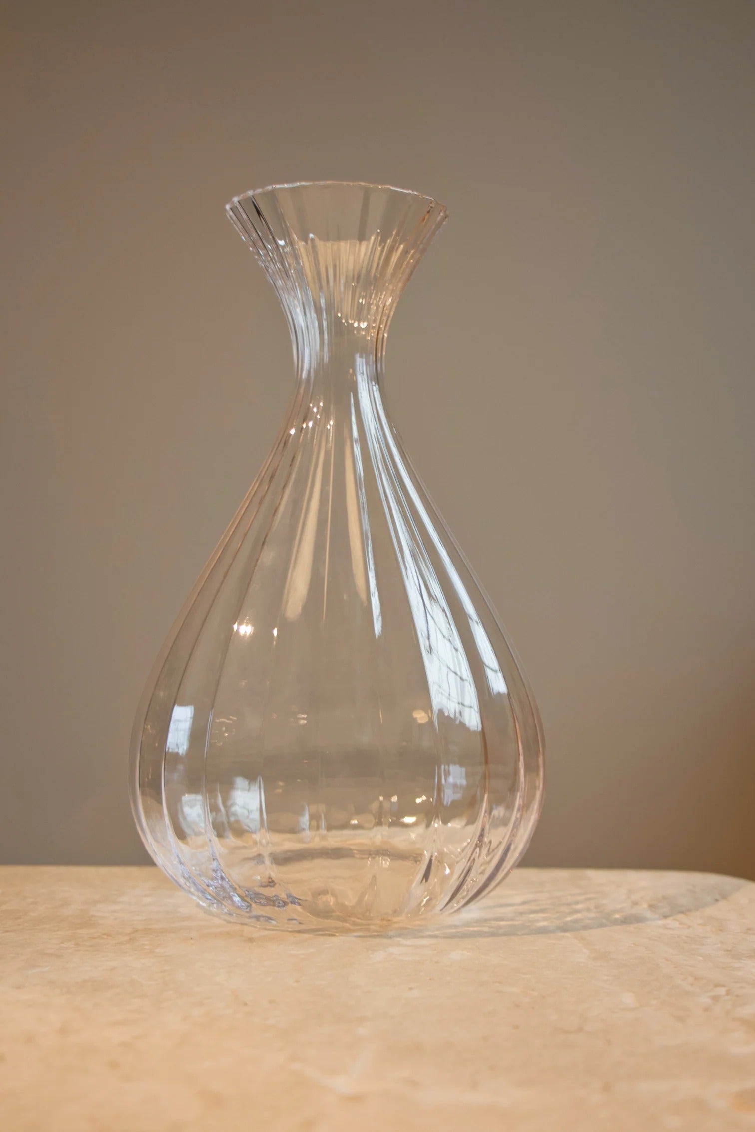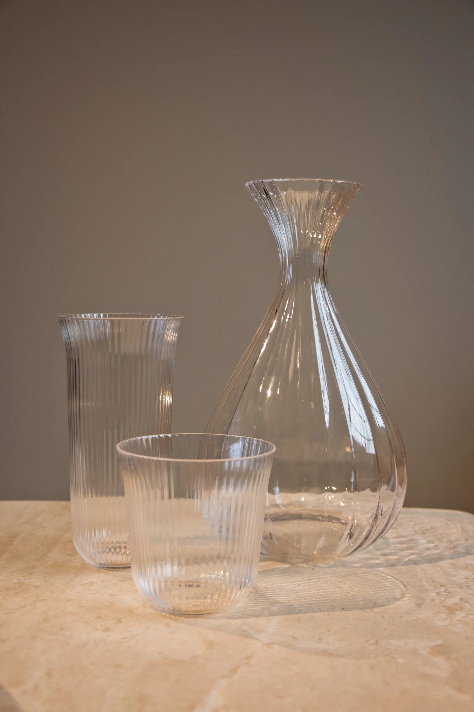 De Inku karaffen zijn uitgevoerd in geribbeld glas, waarbij de tere plooien als de baleinen van een walvis subtiel vervagen naar de rand van het glas toe. Dit elegante ontwerp toont de poëtische kant van Sergio Herman. Ideaal te combineren met de Inku glazen!